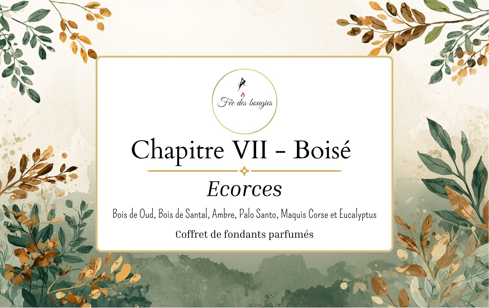 Bois de oud, bois de santal, ambre, palo santo, maquis corse et eucalyptus composent ce Chapitre 7 – Écorces de la Bibliothèque de fondants parfumés Fée des Bougies.